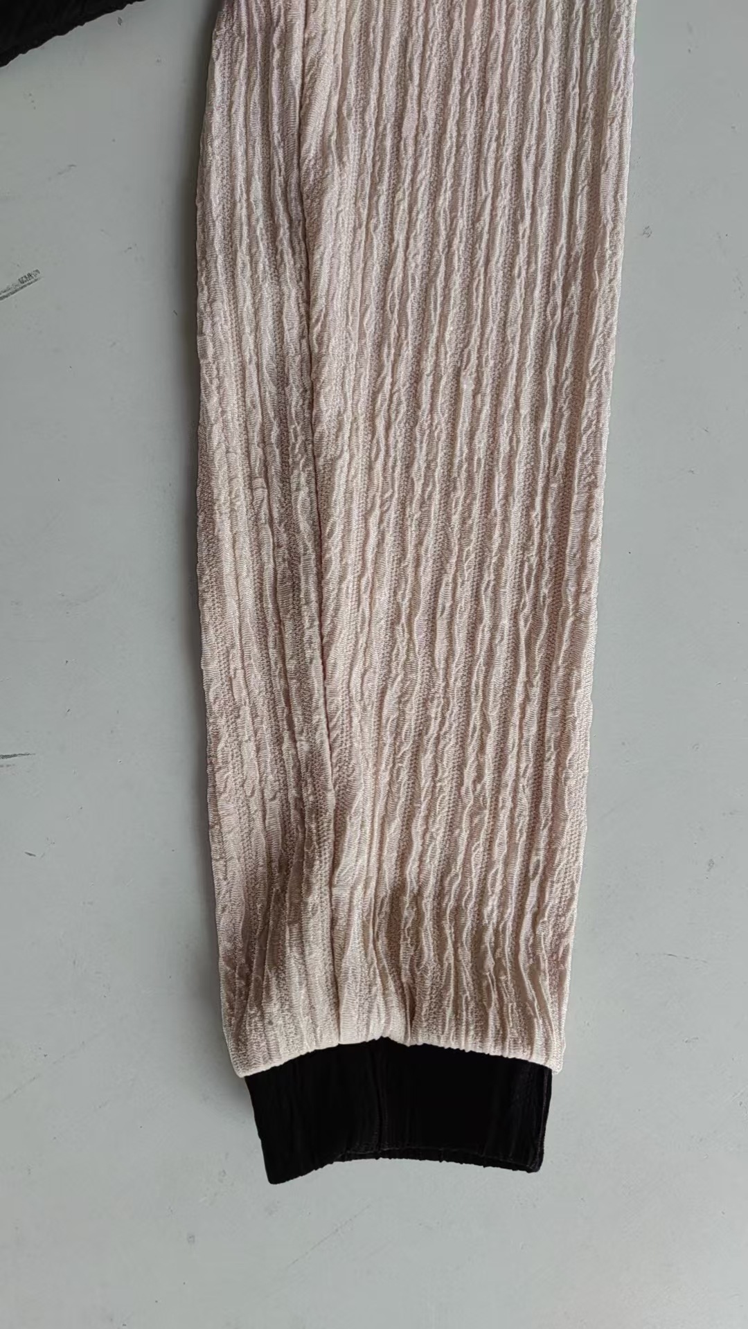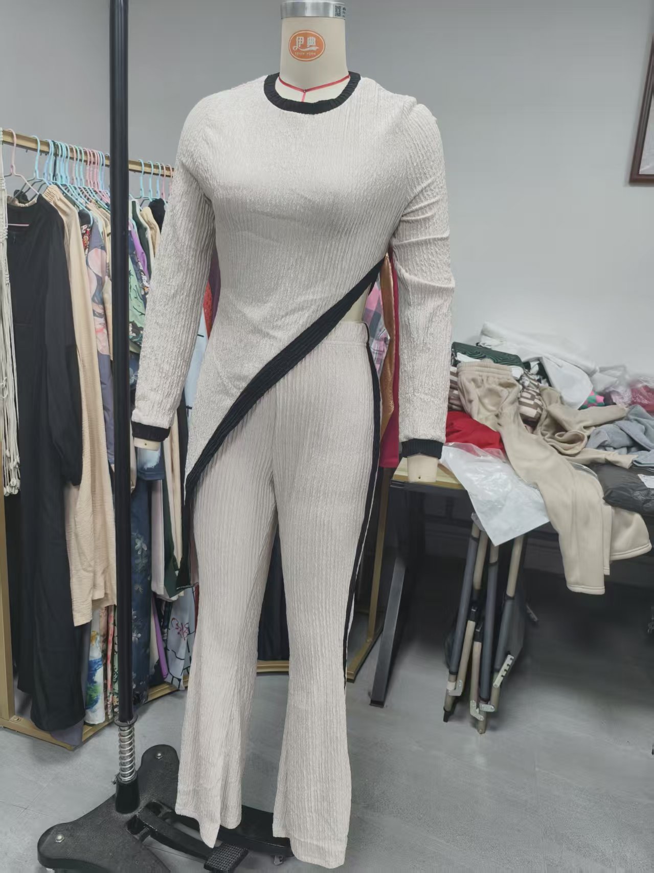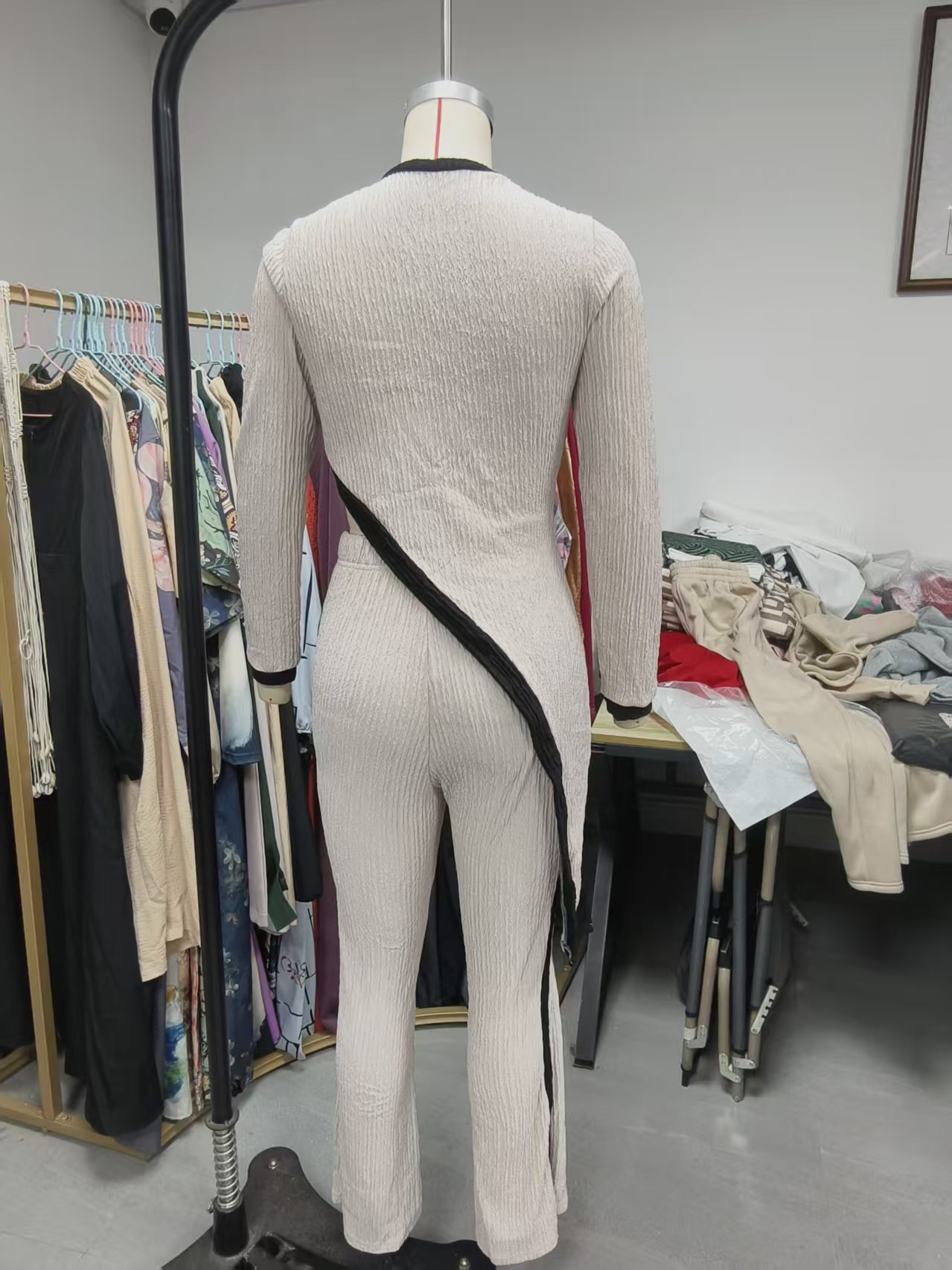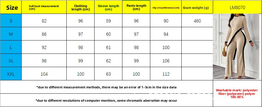 Elegant Design: Features a side-slit T-shirt and patchwork trousers for a stylish look.